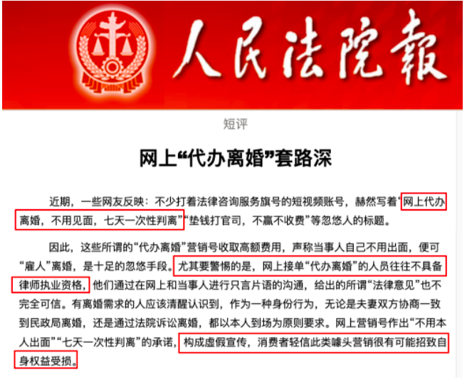 事實(shí)上,“網(wǎng)上代辦離婚”只有專業(yè)律師能夠完成,且主要限于涉港和涉外離婚。法律咨詢公司并不具備律師執(zhí)業(yè)資格,其無法作為代理人,根本無法在法院代辦任何事項(xiàng),其真正能做到的有且僅有協(xié)助當(dāng)事人網(wǎng)上立案。所謂網(wǎng)上代辦離婚,他們不可能能夠?qū)崿F(xiàn)。