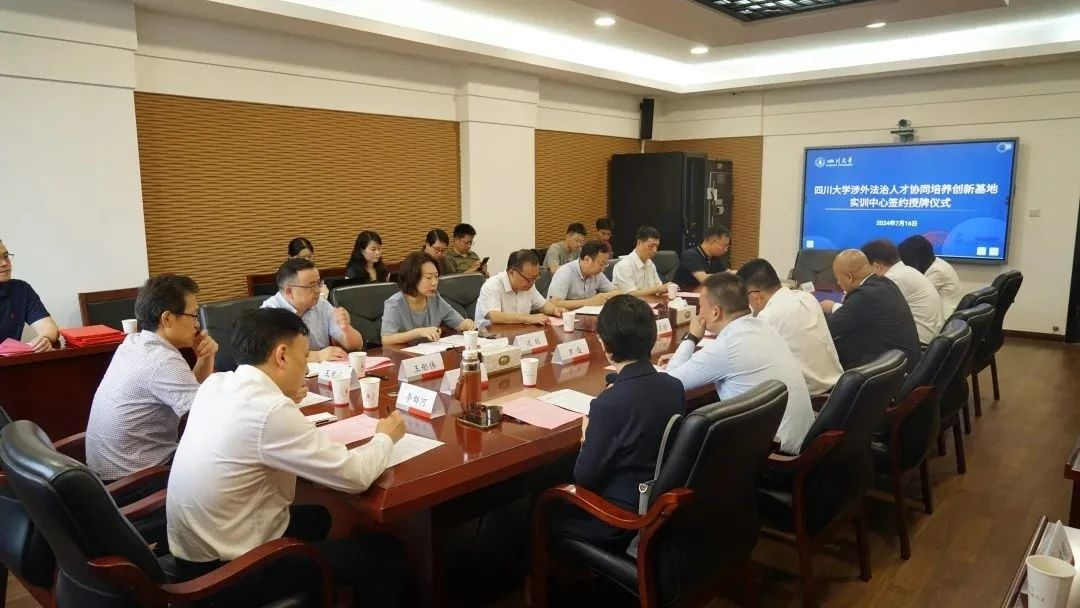 2024年7月16日上午,四川大學涉外法治人才協同培養創新基地實訓中心簽約授牌儀式在四川大學望江校區明德樓舉行。四川大學副校長游勁松出席儀式并見證簽約;四川省司法廳律師工作處副處長況玥、四川省律師協會及實訓中心依托建設單位代表,學校相關部處和法學院負責人參加簽約授牌儀式。儀式由法學院副院長劉昕杰主持。