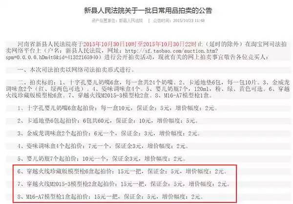 新縣法院發布的競買公告顯示,這些玩具槍除了“CYMA-P.661B模型槍”的起拍價為30元一支,其余的玩具槍起拍價均為15元一支。目前,上述兩場拍賣均已結束,成交價最高的為一支“穿越火線M2015-3模型槍”,該標的物起拍價位15元,最終以205元成交。