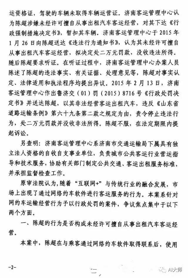 2015年1月,濟南市民陳超在使用滴滴專車軟件開“專車”送客時,被濟南客運管理中心認定為非法運營的“黑車”,予以查扣并處2萬元罰款。不滿處罰結果的陳超一紙訴狀將濟南客運管理中心告上法庭,要求撤銷行政處罰。此案是針對“專車”這一新生事物的首例行政訴訟案,因而被稱為中國“專車第一案”。