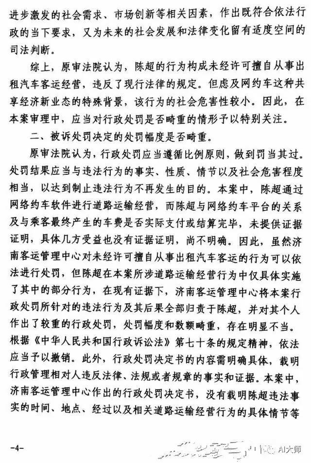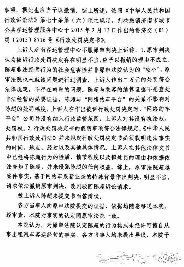 一審判決后,濟南客運管理中心不服一審判決,向濟南市中級人民法院提起上訴。濟南客運管理中心上訴稱,行政處罰決定并不存在處罰畸重的情形,原審判決認為被訴行政處罰決定存在明顯不當,應予以撤銷的理由不成立。行政處罰決定書的載明事項符合法律規定。原審法院超越案件事實,基于網約車系新業態的特殊背景做出判決,明顯不當。請求依法撤銷原審判決,改判駁回陳超訴訟請求。