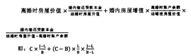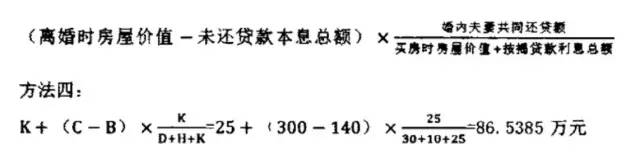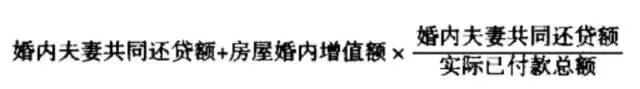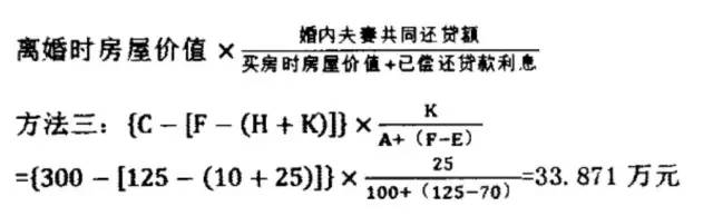 該方法是用婚內夫妻共同還貸額加上房屋婚內增值額乘以婚內夫妻共同還貸額占實際已付款總額的比例。(C-B)是房屋婚內增值額,D+H+K是實際已付款總額。即: