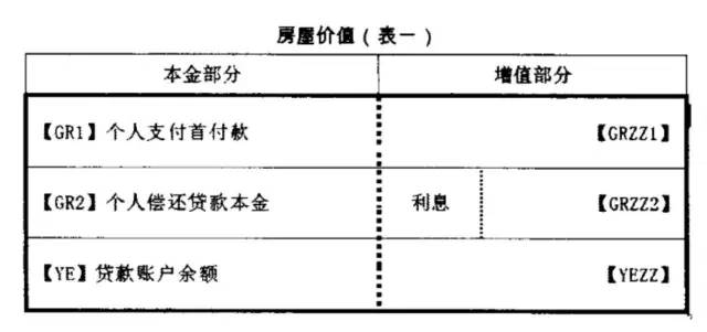 表一是個人按揭貸款購買房屋并償還部分銀行貸款,在尚未清償貸款的任意時間結點,房屋有一定自然增值情況下的房屋價值構成表。粗實線方框代表計算時間結點的房屋價值總額,粗虛線左側區域代表房屋本金部分,右側區域代表房屋增值部分。本金部分又細分為3個區域,分別是個人支付首付款區域(GR 1區),個人償還貸款本金區域(GR 2區),貸款賬戶余額區域(YE區)。在增值部分也細分為3個區域,與本金部分3個區域橫向對應,分別是個人增值一區(GRZZ1區)、個人增值二區(GRZZ2區)、余額增值區(YEZZ區),GRZZ2區中還有一條細虛線,細虛線與粗虛線之間的區域是利息區,利息區從屬于GRZZ2區。