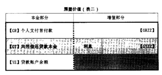 如果把房屋購買總價視為房屋的全部本金的話,房屋本金由首付款和貸款金額組成。個人償還一定貸款的情況下,房屋本金由首付款、償還貸款本金和貸款賬戶余額組成。假定支付一定的房屋本金,就對應一定比例的房屋,則一定比例房屋的增值一定對應該比例的本金。根據這一日常經驗法則,可以肯定表一中GRZZ1區是GR1區相對應的財產增值部分,GRZZ2區是GR2區相對應的財產增值部分。由于GR2區是以貸款支付,貸款需要支付利息,但利息并不屬于本金,只能算GR2區的成本,GRZZ2區扣除GR2區的利息成本,就是GR2區的收益。