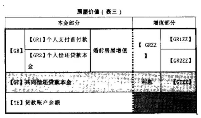 表三中,有淺色底紋的區域即GT區和 GTZZ區,是全部應當按照共同財產分割的區域。有深色底紋的區域即YEZZ區,是一定比例應當按照共同財產分割的區域,這個比例就是共同償還貸款本金占結婚時房屋價值與離婚時貸款賬戶余額之差的比例。