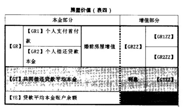 表三是甲個人支付首付款按揭貸款購買房屋,婚前個人償還部分銀行貸款,然后與乙結婚,婚后用共同財產又償還銀行貸款,在尚未清償貸款的任意時間結點,房屋有一定自然增值情況下的房屋價值構成表。表三與表二和表一的不同主要在于房屋價值的本金部分,表一和表二是把房屋購買總價視為房屋的本金,表三是把甲乙結婚時間結點的房屋價值作為房屋價值的本金。甲乙結婚時間結點的房屋價值中,除去該時間結點的房屋債務外,均屬于甲個人所有,由個人支付首付款、個人償還貸款本金及婚前房屋增值3部分組成,相當于表一的房屋全部價值中除YE區以外的價值。為便于理解,可以假設甲在與乙結婚的時間結點重新辦理一筆銀行貸款,貸款金額與原按揭貸款賬戶余額相同,就是表三中GT區與YE區之和,甲用新貸清償舊貸,那么在甲乙結婚時,房屋的按揭貸款金額就是原貸款的賬戶余額,結婚時間結點房屋價值減去按揭貸款的數額就相當于首付款,就是表三中的GR區。同樣根據前述日常經驗法則,表三中GRZZ區是GR區相對應的財產增值部分,GTZZ區是GT區相對應的財產增值部分,GTZZ區扣減GT區的利息是GT區的收益,YEZZ區是GR區和GT區共同對應的財產增值部分。根據按出資比例分配的一般原則,忽略付款的時間因素,按照GR區與GT區的比例可以對YEZZ區進行分配,確定屬于共同財產價值的數額。