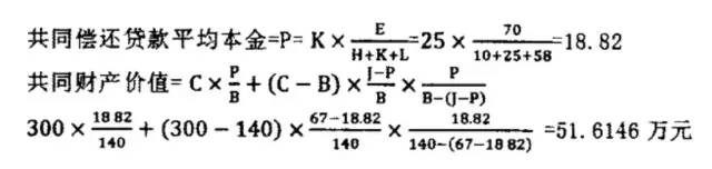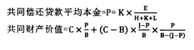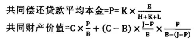 為了使公式看起來更簡潔,把共同償還貸款平均本金公式用P來代表,平均本金賬戶余額就是J-P。將P和J-P代入前述公式后得出房屋中應當按照共同財產分割的價值計算公式: