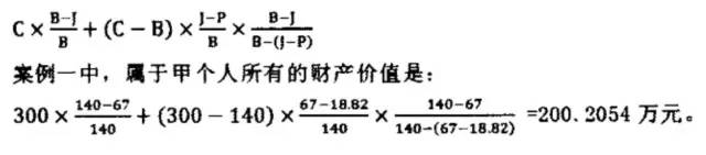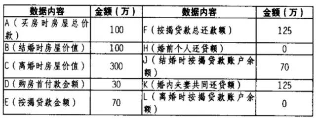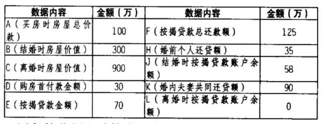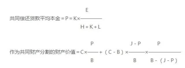 B=共同擁有房屋權益開始時的房屋價值,C=共同擁有房屋權益結束時的房屋價值,E=按揭貸款金額,H=個人償還銀行貸款額,K=共同償還銀行貸款額,J=共同償還按揭貸款時的賬戶余額,L=分割房屋時的按揭貸款賬戶余額。