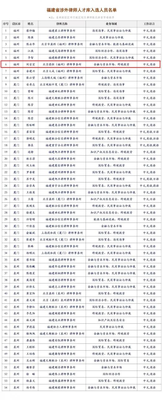 福建省司法廳經組織各設區市司法局、平潭綜合實驗區司法辦進行入庫申報,并對各地申報材料進行集中審核,經征求省律師協會意見后,形成了《福建省涉外律師人才庫入選人員名單》并予以公布。德恒福州劉宗宏律師成功入選。