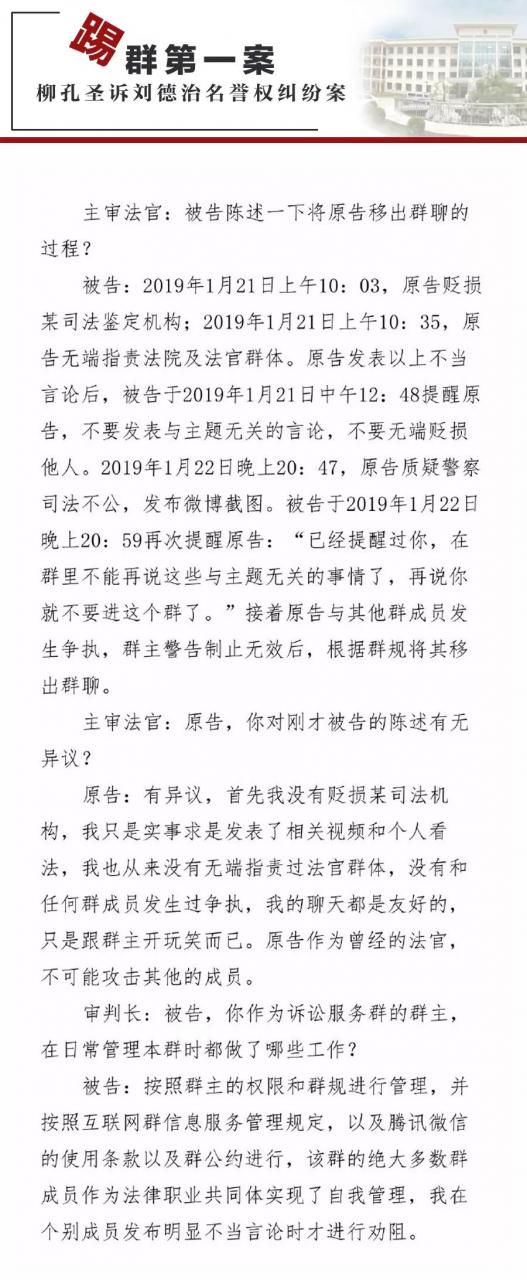 劉德治答辯稱,柳孔圣被移出群聊是群主的個人行為,應駁回其起訴。首先,從該群的性質和目的看,該群是個人建立的,目的是供不特定的律師和法律工作者相互交流、討論訴訟和立案方面的有關問題。將發表不當言論的柳孔圣移出群聊是群主對本群進行管理的自治行為,符合群規。