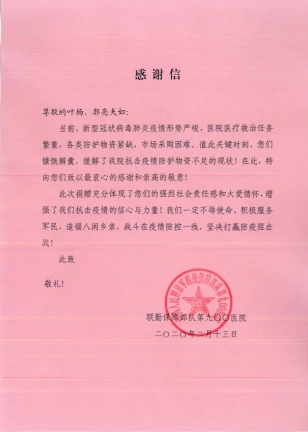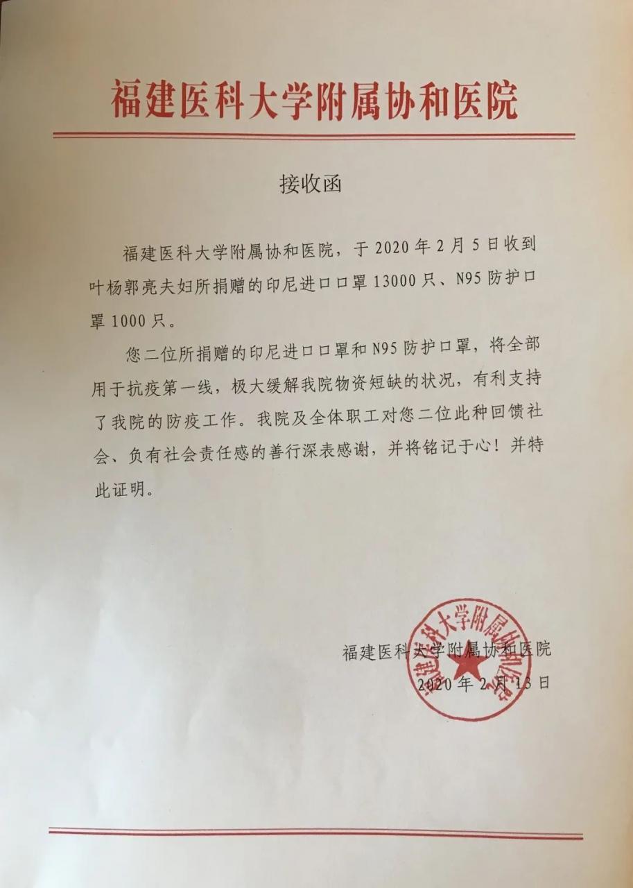 ? ? ?春節期間,葉楊律師正在國外旅游,聽聞祖國發生疫情后,時刻憂心疫情發展,第一時間放棄旅游,帶領家屬奔走于國外各大藥房,購買了3萬個口罩捐贈給中國人民解放軍聯勤保障部隊第900醫院和福建醫科大學附屬協和醫院。同時葉楊律師還積極捐款,充分詮釋著一方有難,八方支援的精神。
