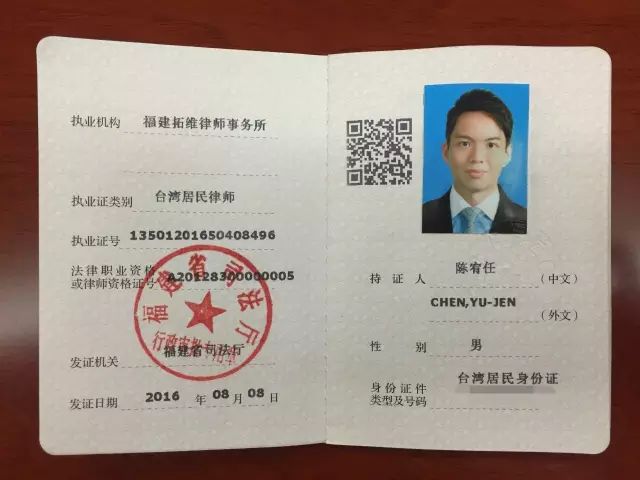 近日,拓維律師事務所陳宥任律師正式取得律師執業證,成為福州首位臺灣籍律師。