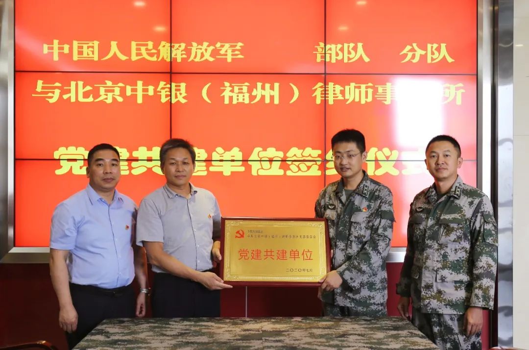 為加強律所黨建工作與部隊黨建工作的交流與合作,值“八一”建軍節來臨之際,中銀黨支部與解放軍駐榕某部黨委開展黨建共建系列活動。雙方簽署黨建共建協議書,通過黨建共同活動,共筑組織基礎,共促隊伍建設,共謀雙方發展。