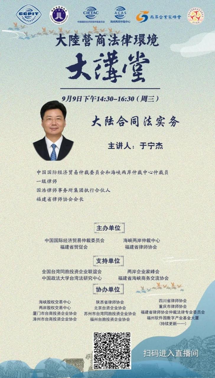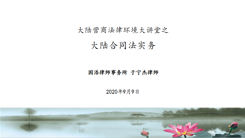 “大陸營商法律環境大講堂”預告丨省律協會長于寧杰:大陸合同法實務分類: 福州律師資訊2020年9月7日標簽: 刑事案件勞動合同夫妻共同債務夫妻共同財產房屋買賣合同房屋租賃合同福州交通事故律師福州人力資源律師福州公司法務律師福州公司法律師福州勞動法律師福州律師福州房產律師福州房屋律師福州離婚律師蔡思斌 福州律師資訊 為便利臺商臺企在大陸投資興業,中國國際經濟貿易仲裁委員會、海峽兩岸仲裁中心、福建貿促會、福建省律師協會等單位聯合舉辦“大陸營商法律環境大講堂”。本次活動得到了全國臺企聯、兩岸企業家峰會等單位的大力支持。 大講堂第八期將于9月9日(周三)下午14:30-16:30舉行,邀請貿仲、海峽兩岸仲裁中心仲裁員,一級律師,國浩律師事務所集團執行合伙人,福建省律師協會會長于寧杰老師主講“大陸合同法實務”! 部分課件 (完整課件可在直播間下載) 來源:海峽兩岸仲裁中心 分享此文文章導航上一個上一篇文章福州律協順利召開第三屆監事會履職培訓會暨工作座談會下一個下一篇文章福州市各律師事務所黨組織深入學習黨的十九屆四中全會精神相關文章聚焦財稅與社保合規管理,福州律協專題培訓報名開啟,速來報名!2025年10月24日福州律協舉辦境內外資產保護傳承信托實務交流活動2025年10月24日深化良性互動 強化職責使命——福州市律師協會赴倉山法院參加訴訟服務工作交流座談會2025年10月21日我玫瑰,我鏗鏘——福建省女律師菁英人才集訓營(第六期)圓滿收官2025年10月21日山海協作 共筑行業自律新高地——慶陽市律師協會到訪福州市律師協會座談交流2025年10月17日大成福州律師受邀為福建空管分局開展違法違紀警示教育的法治講座2025年10月17日