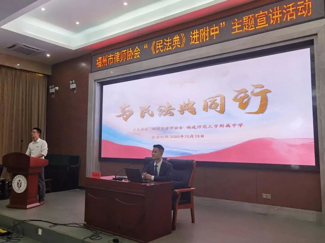 ◎10月13日 福州律協(xié)與福建師范大學(xué)附屬中學(xué)聯(lián)合舉辦“與民法典同行”主題宣講活動。主講人張翯琦律師首先以卡通短片的形式,將民法典的前世今生和重大意義進行了系統(tǒng)性的介紹。針對同學(xué)們關(guān)心的法律問題,以他們熟悉的視角,通過真實案例結(jié)合民法典展開講授。