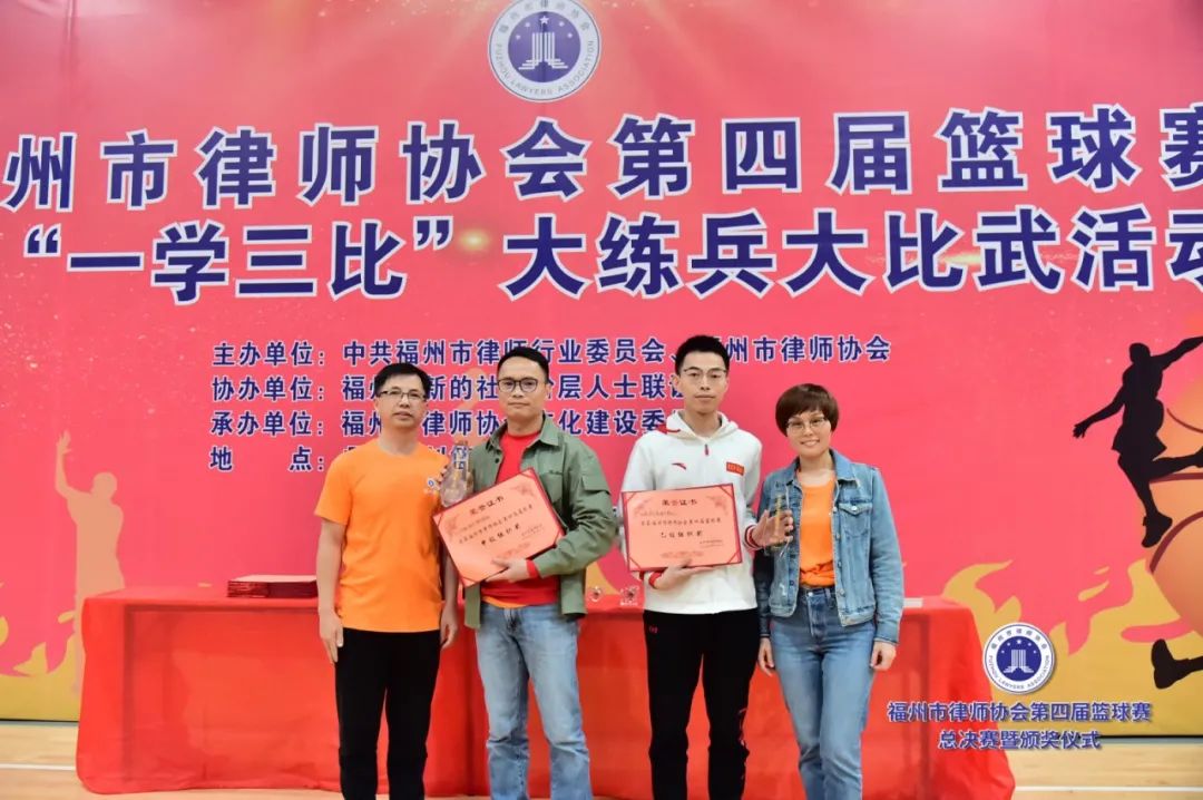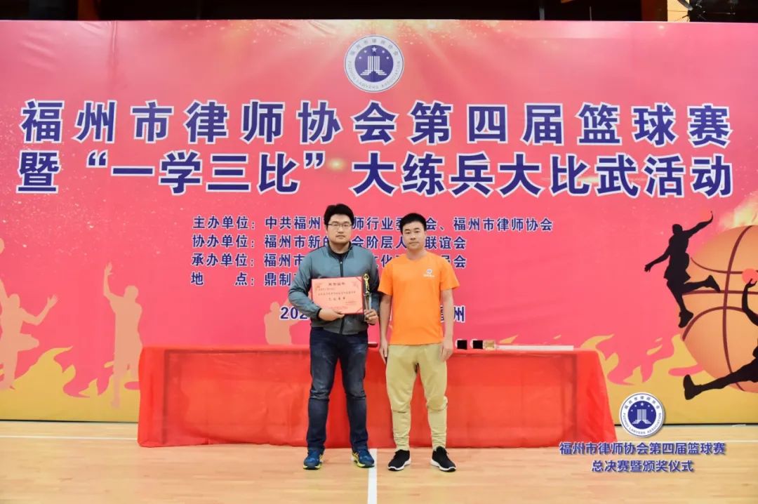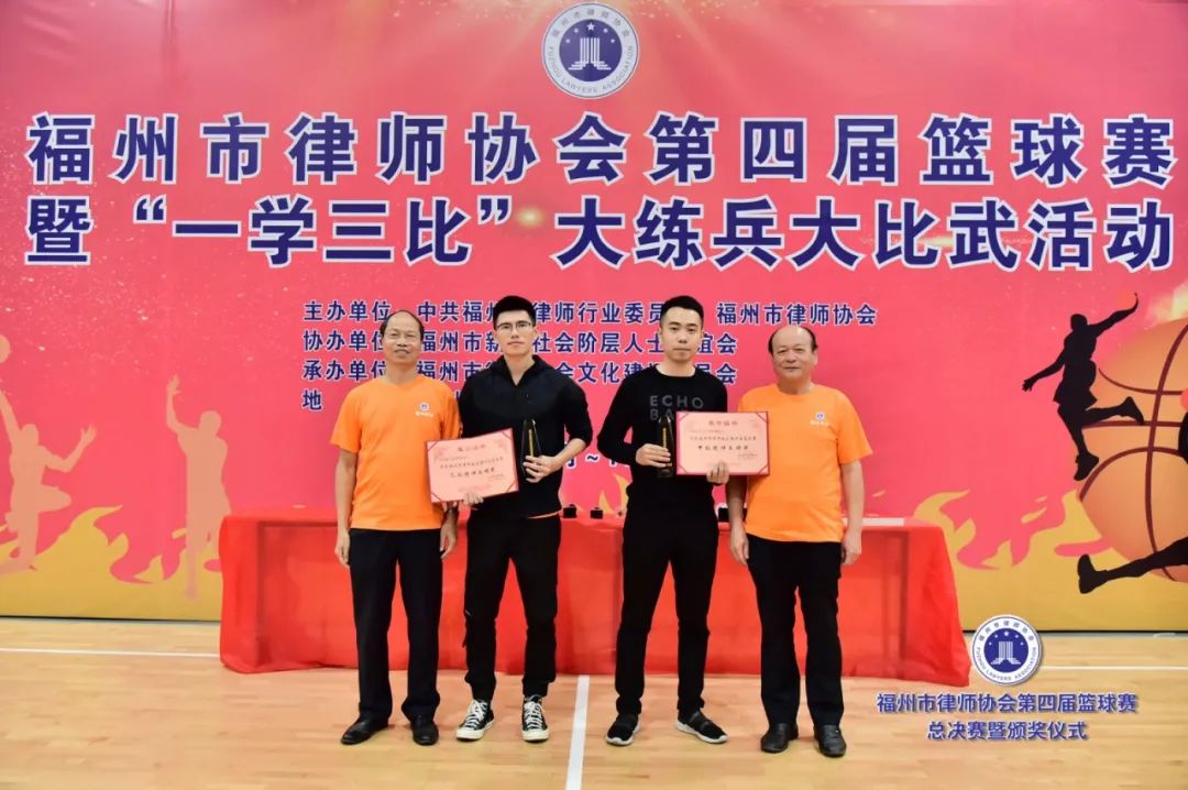 副會(huì)長吳玉姜、陳立新為獲得最有價(jià)值球員獎(jiǎng)的北京大成(福州)律師事務(wù)所潘澤煒(甲級(jí))、福建閩眾律師事務(wù)所黃開捷頒獎(jiǎng)(乙級(jí))▲